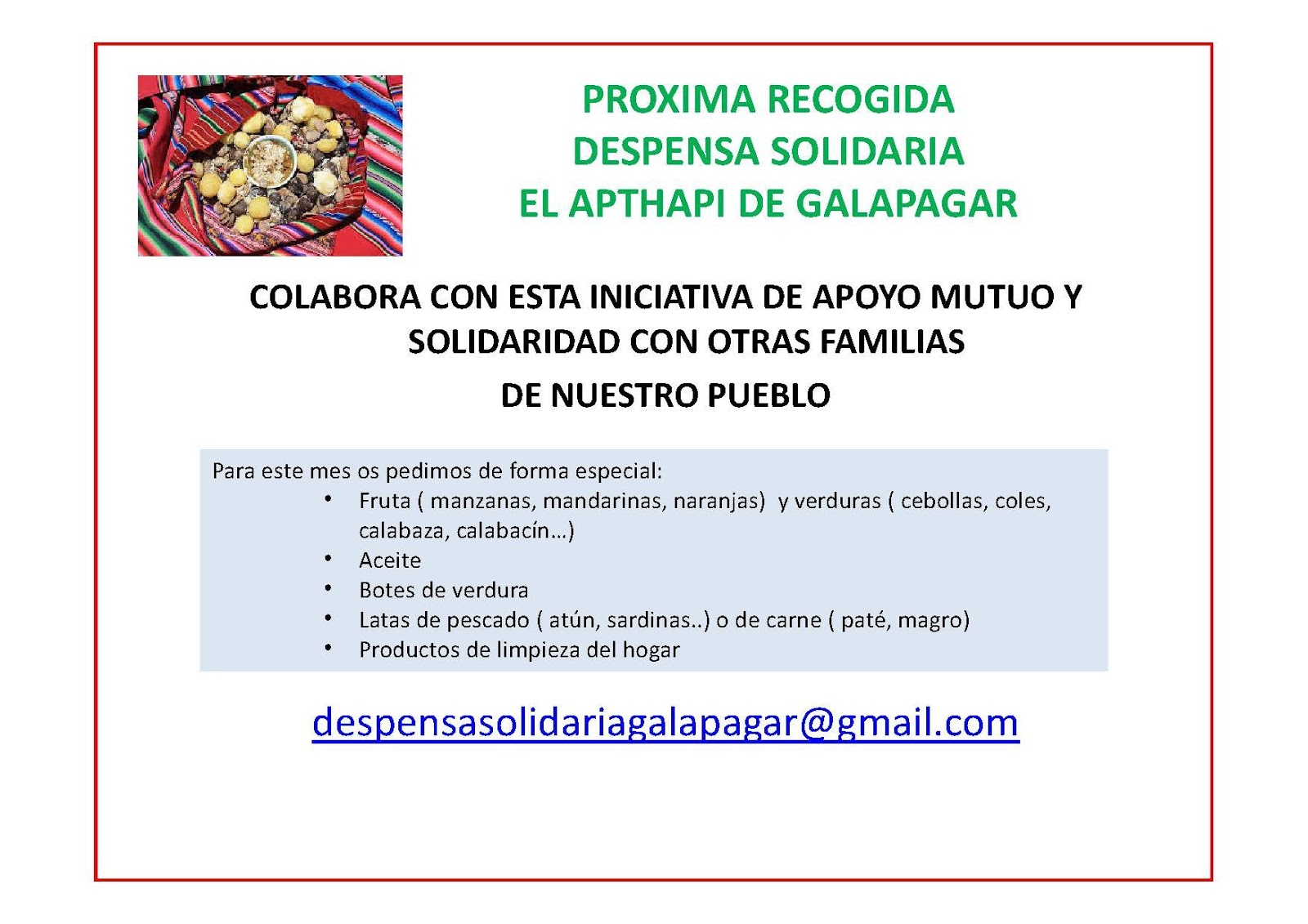 Os animamos a colaborar con esta labor que defiende el derecho a la alimentación y fomenta el apoyo entre familias de la localidad.